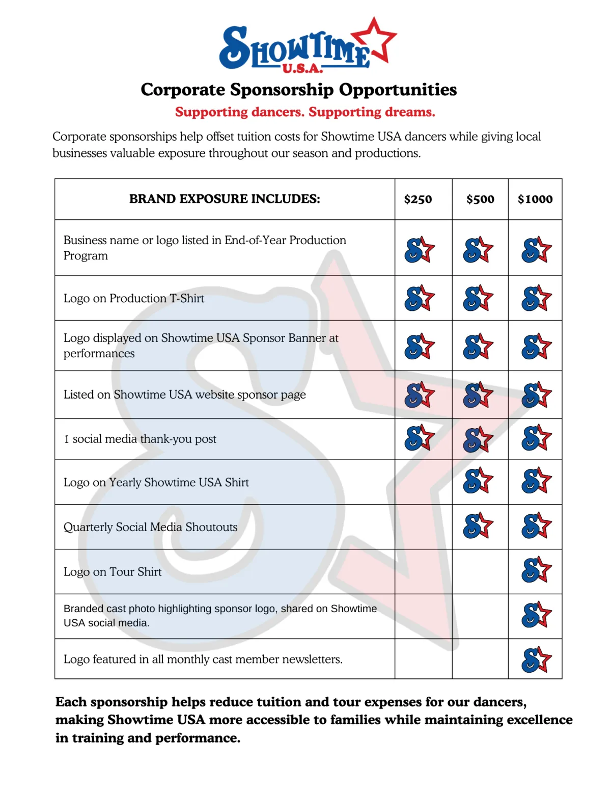 By signing below, I authorize the use of my business name and/or logo on printed materials, the Showtime USA website, newsletters, and social media. I understand that a portion of my sponsorship helps support dancer tuition and tour expenses, and I acknowledge that Showtime USA is a for-profit organization, therefore this sponsorship is not a charitable donation.